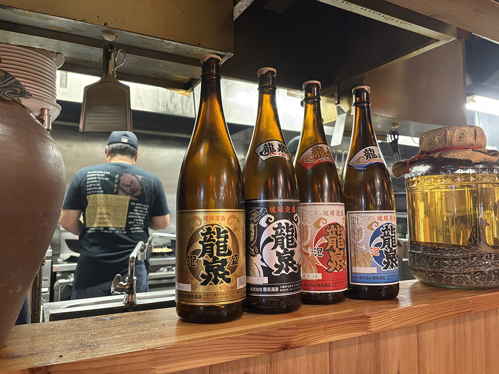 오키나와의 지역 술로 유명한 아와모라와 오키나와 뱀인 하브로 만든 하브슈가 보입니다. 하브슈는 오키나와 비아그라로도 불립니다.