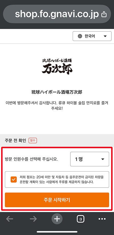 원하는 언어가 나오면 방문 인원수를 선택하고 주의 사항에 체크 후 주문을 시작합니다.