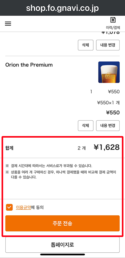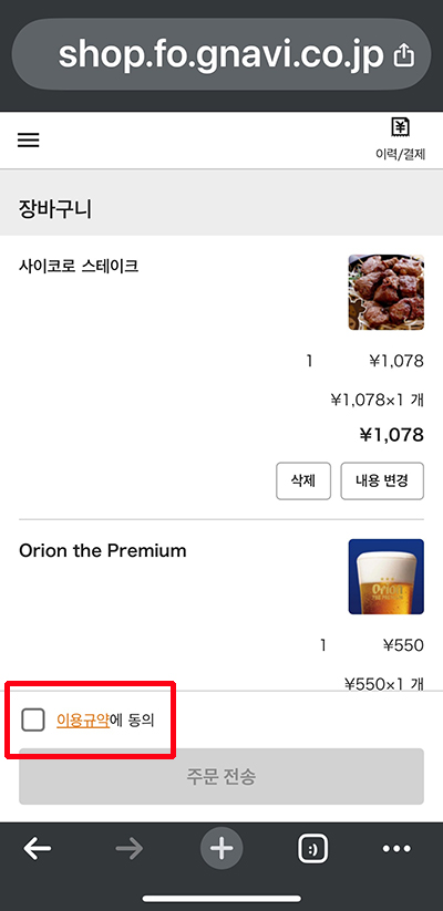 장바구니를 보니 스테이크와 맥주가 선택되어 있습니다. 이용규약에 동의하고 가격과 주문 내용을 꼼꼼히 확인 한 뒤 주문 전송을 누릅니다.