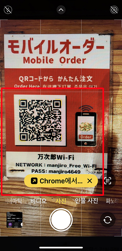 이제 주문을 해 보겠습니다. 먼저 곳곳에 붙어 있는 QR 코드가 보이면 스마트폰 카메라 또는 구글 검색창에서 카메라를 선택하여 QR 코드를 스캔합니다.