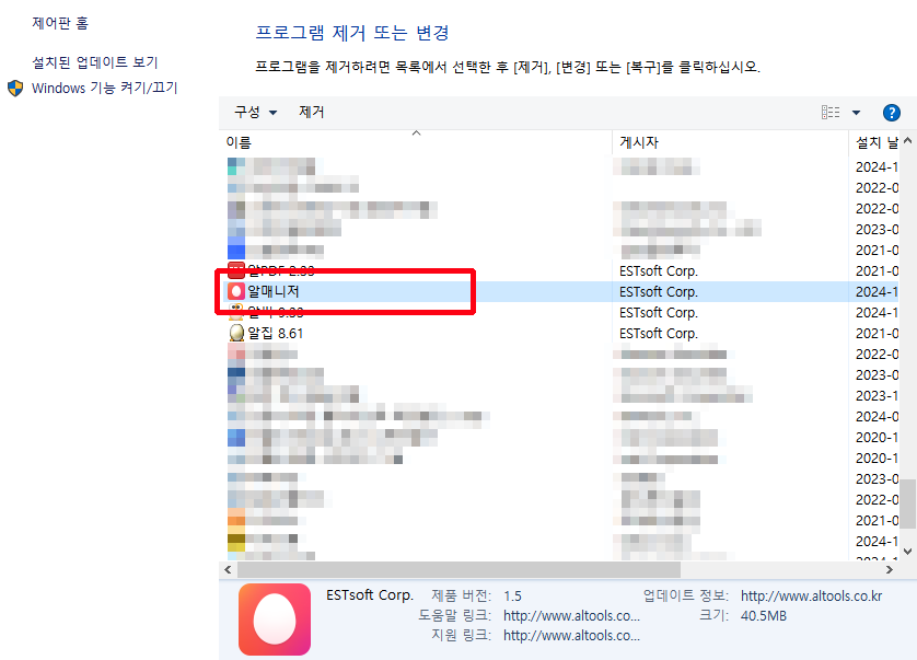 먼저 프로그램 제거 또는 변경으로 들어가 알매니저를 삭제합니다.