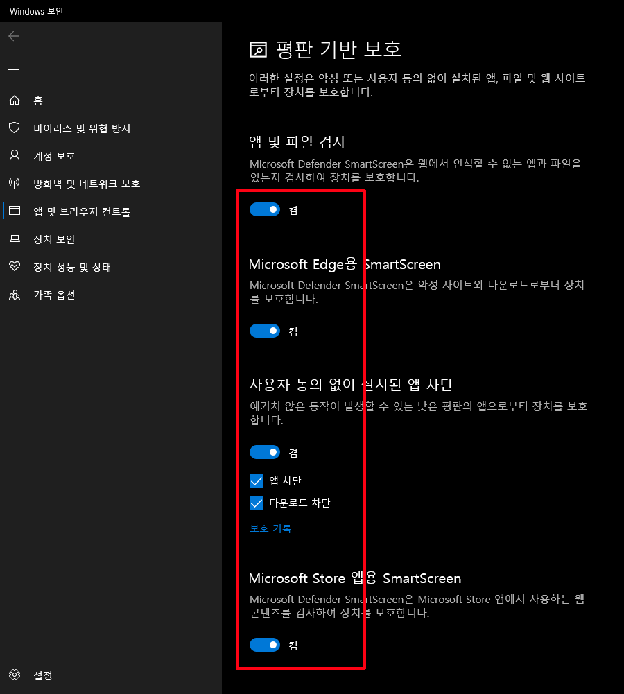 다음은 윈도우 검색창에 평판 기반 보호를 입력해서 들어가서 아래와 같이 설정하면 알툴즈 광고가 나오지 않게 됩니다.