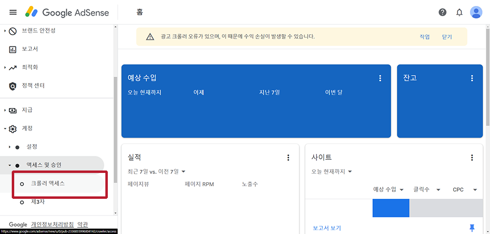 애드센스에 접속하니 '광고 크롤러 오류가 있으며, 이 때문에 수익 손실이 발생할 수 있습니다.' 라는 문구가 보입니다.