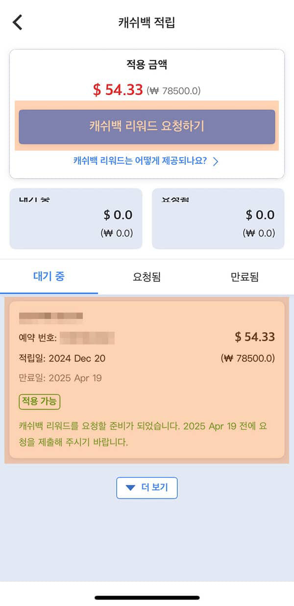 캐쉬백 리워드 상태는 처리 중, 요청 가능 또는 만료됨으로 표시됩니다.