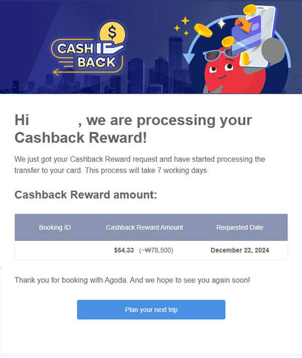 아고다 계정에서 적립된 캐쉬백 상태를 확인하고 선택하신 카드 또는 계좌로 캐쉬백 리워드를 받으실 수 있습니다.