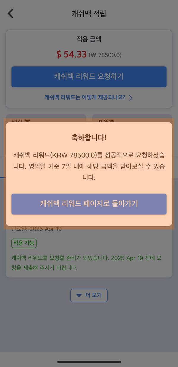 캐쉬백 리워드를 요청할 수 있음을 의미합니다.