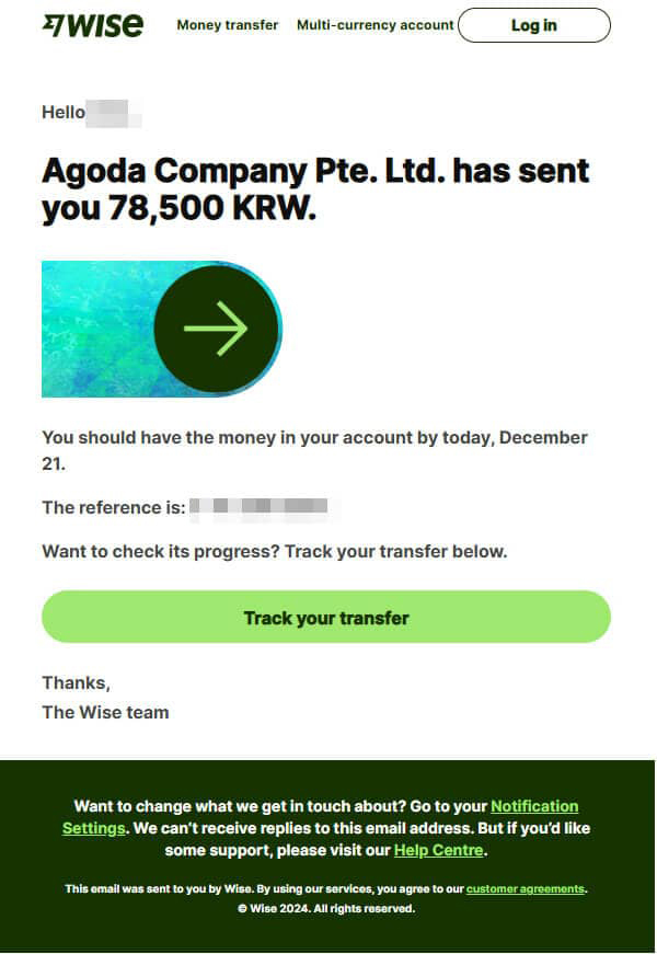 곧 바로 아래와 같은 메일이 오게 되는데 메일을 보기 전 입금 알림이 먼저 옵니다. 아고다 캐시백은 계좌로 받을 경우 신청하자마자 빠르게 입금이 됩니다.