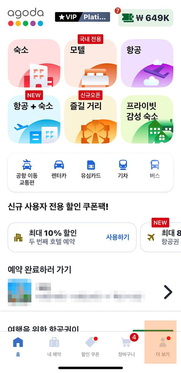 아고다 앱에 로그인하고 하단의 더 보기를 클릭합니다.