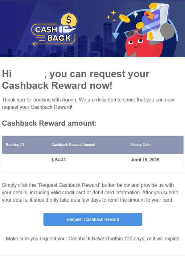 아고다 계정에서 적립된 캐쉬백 상태를 확인하고 선택하신 카드 또는 계좌로 캐쉬백 리워드를 받으실 수 있습니다.