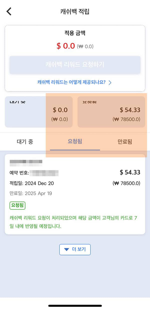 캐쉬백 리워드 상태는 처리 중, 요청 가능 또는 만료됨으로 표시됩니다.