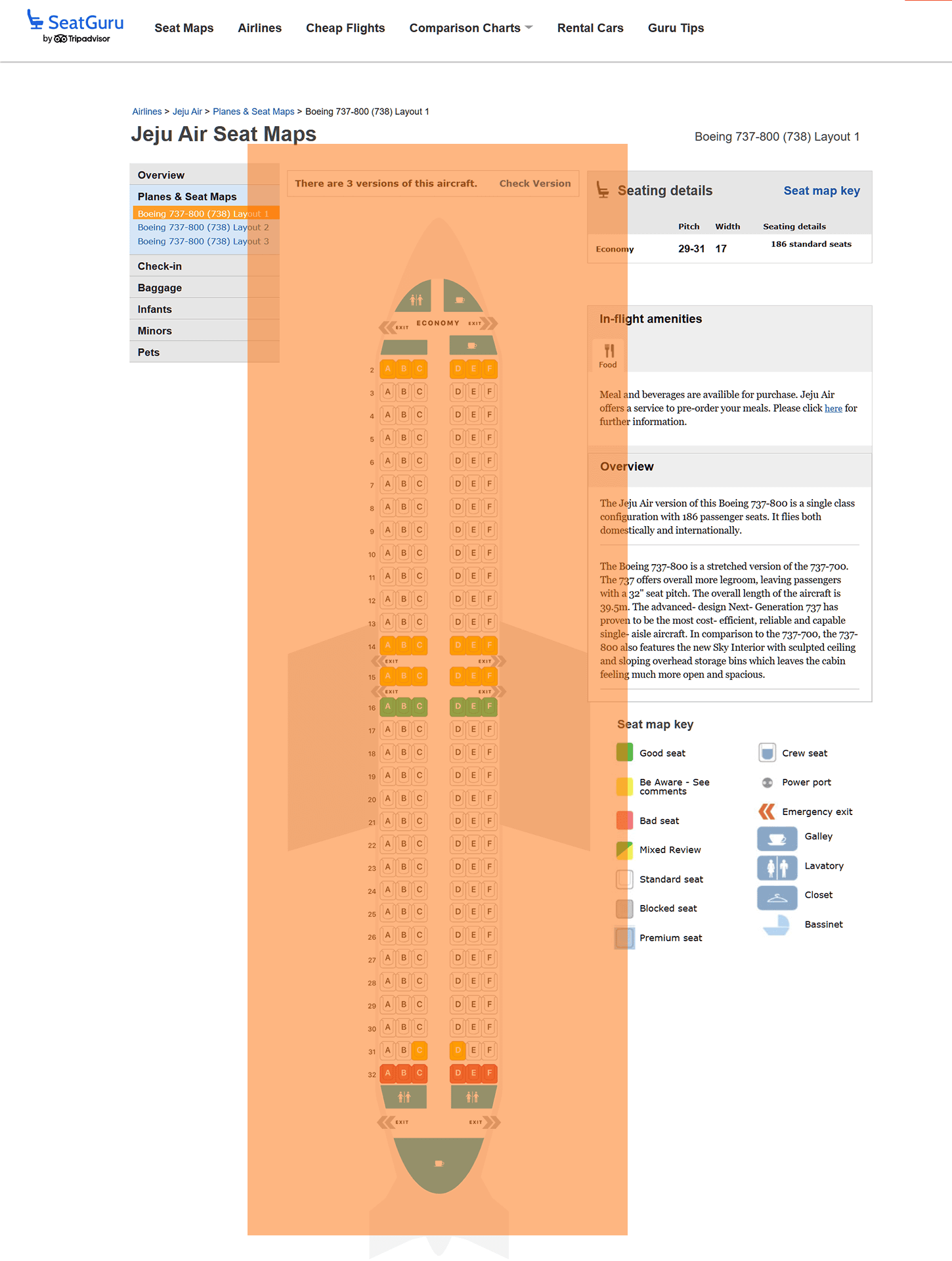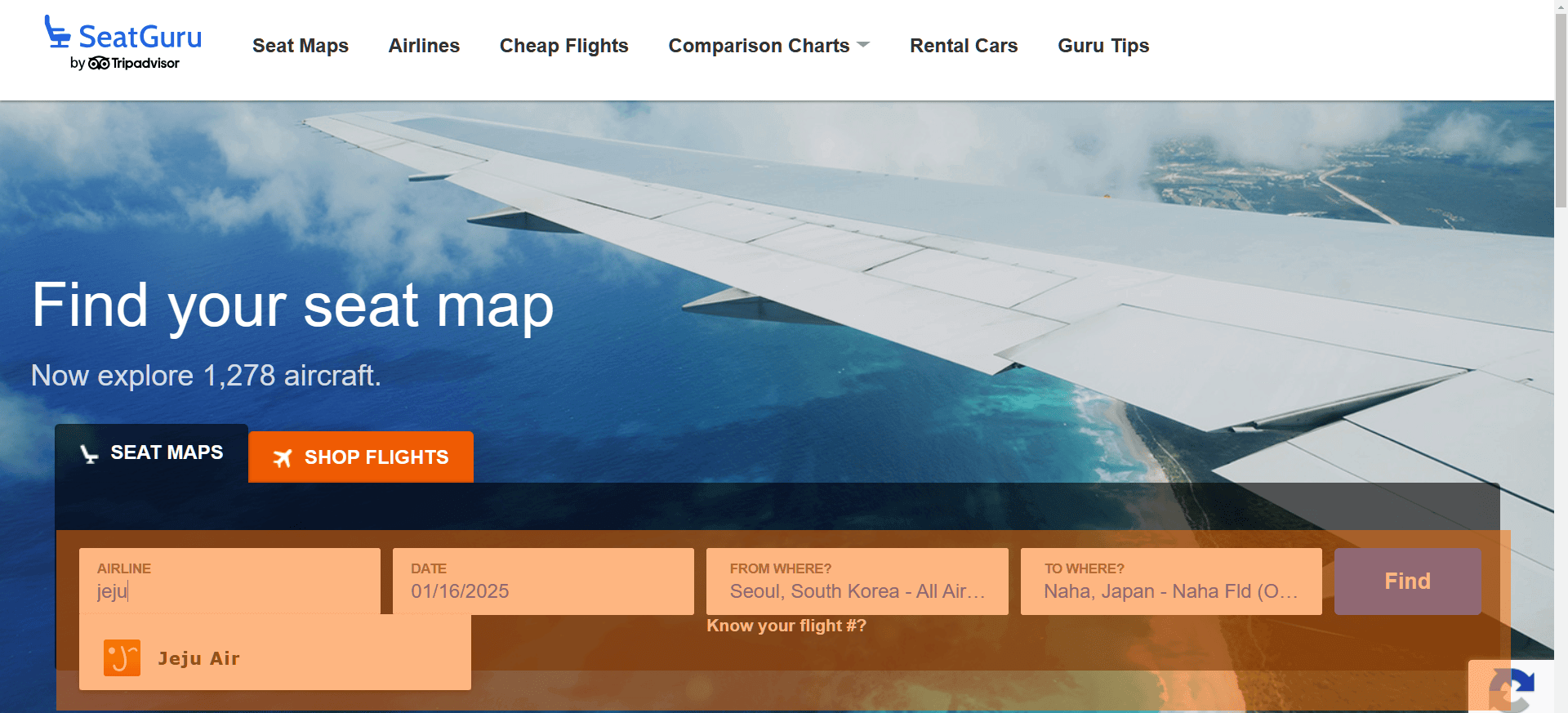 SeatGuru (시트구루)는 항공편의 시간, 예약, 기종, 좌석 배치도를 제공하는 전문 사이트로 매우 유용하고 인기가 있는 사이트입니다.