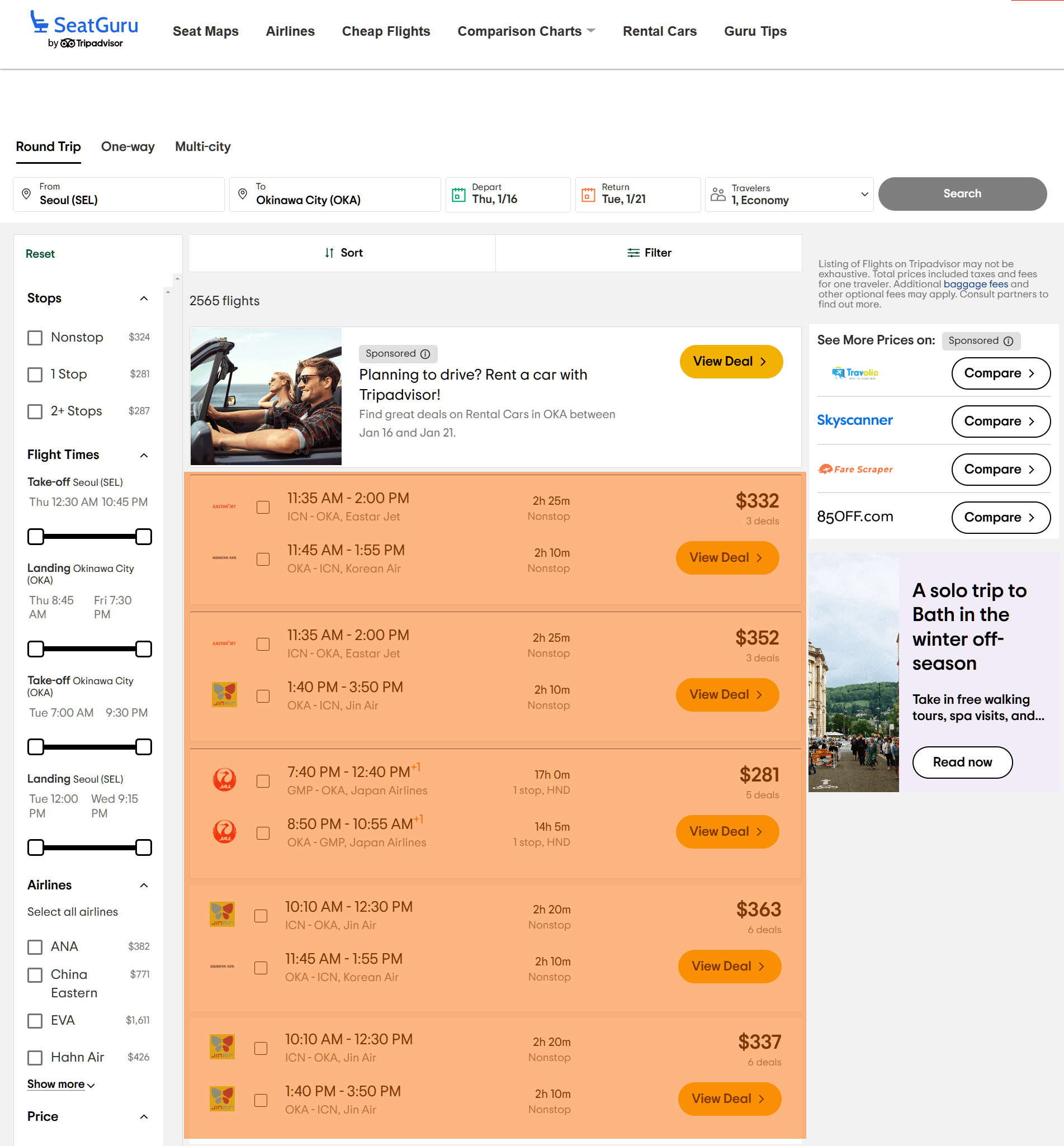 SeatGuru(시트구루) 홈페이지에 접속하고 SHOP FLIGHTS (샵 플라이트)를 클릭하고 여행 정보를 입력하면 항공권 예약 사이트로 연결이 되는 링크와 시간, 가격을 알 수 있습니다.