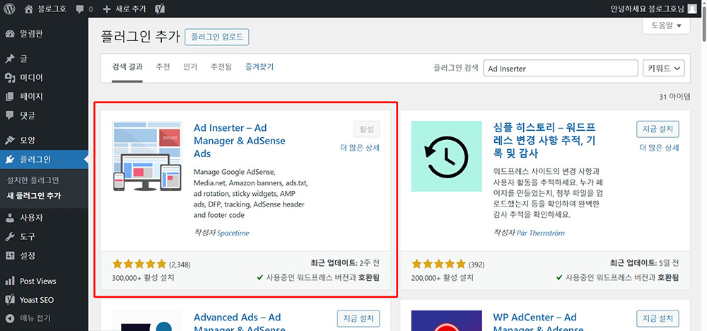 워드프레스 관리자 페이지 플러그인에서 Ad Inserter를 추가하고 활성화 합니다.
