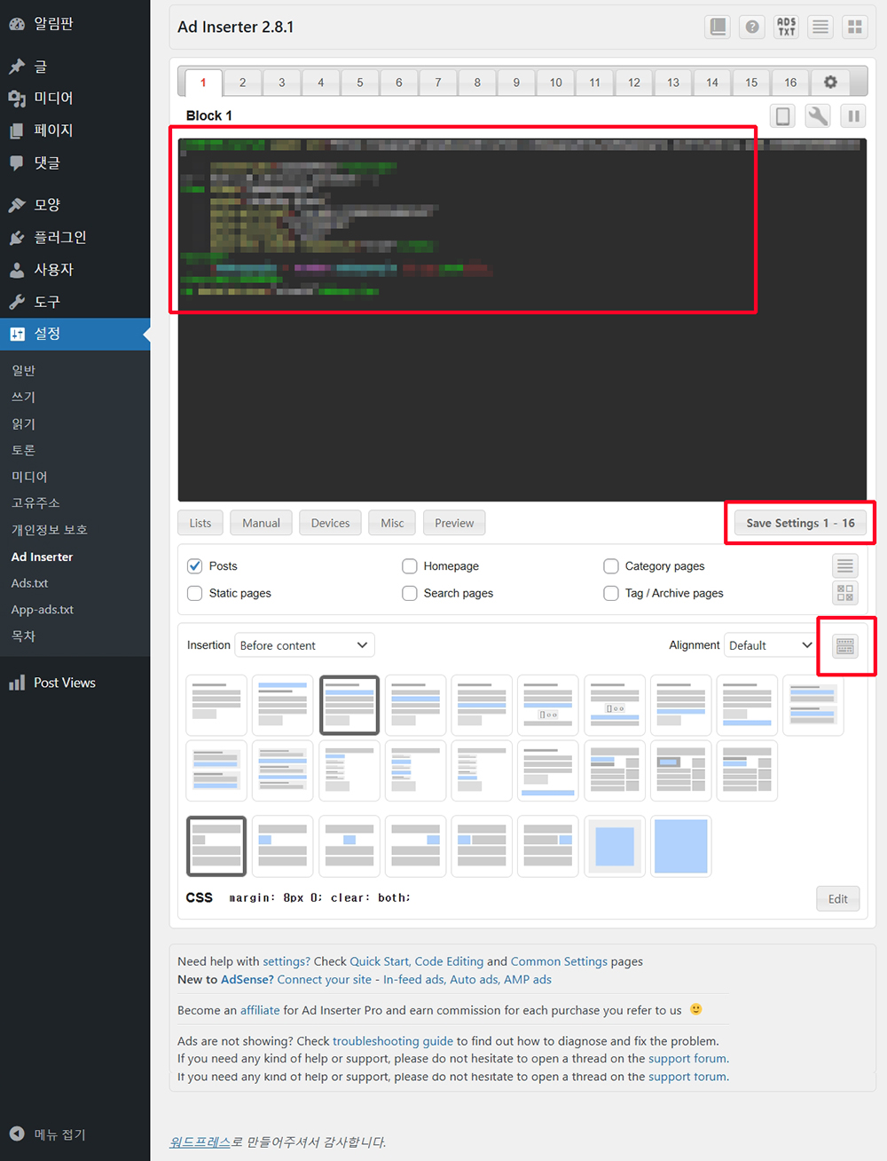 - 플러그인을 활성화한 후 '설정 > Ad Inserter' 메뉴에서 기본 설정을 진행합니다.