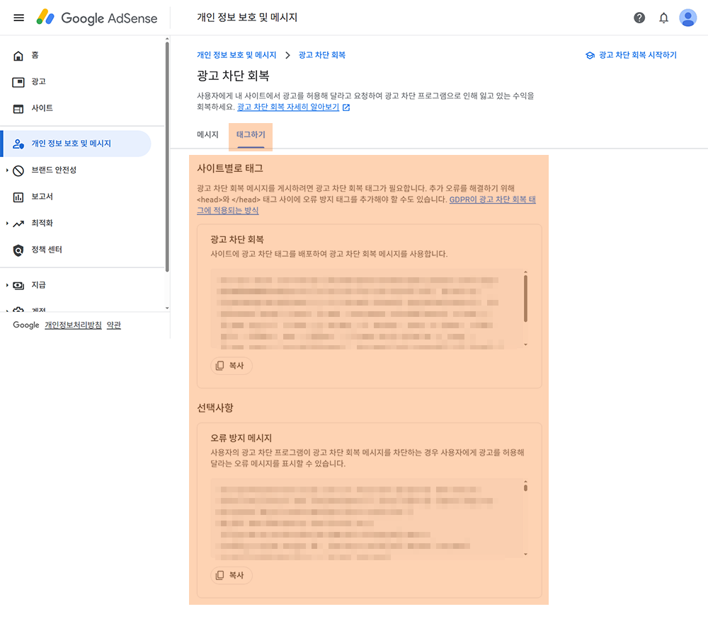 메시지를 게시하면 애드센스에서 사이트에 추가해야 할 **태그(코드 스니펫)**를 제공합니다. 이 태그는 광고 차단 해제 요청 메시지가 사이트에서 올바르게 작동하도록 하는 역할을 합니다.