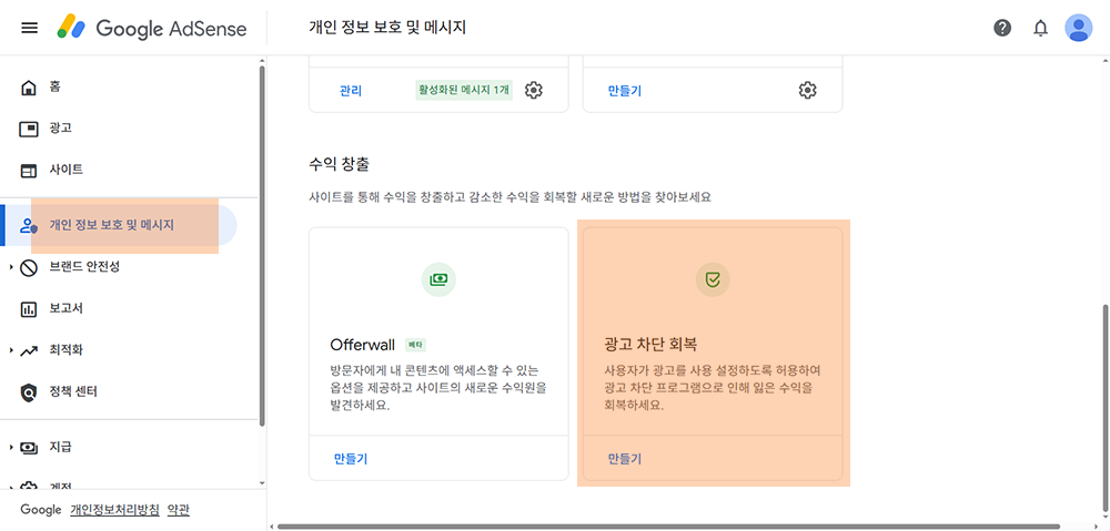 1단계: 애드센스에서 '개인 정보 보호 및 메시지' 메뉴 접속