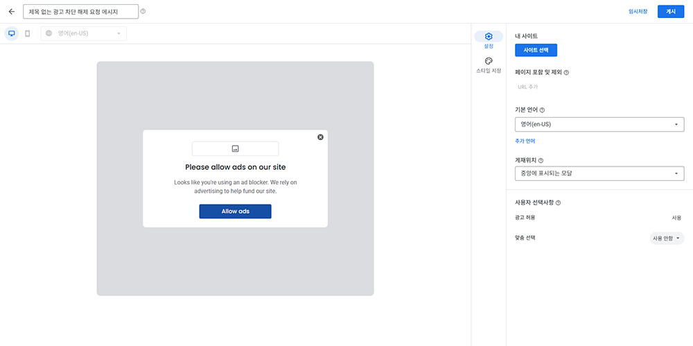 메시지 내용을 맞춤 설정합니다. 기본 제공되는 문구를 사용하거나, 사이트의 톤앤매너에 맞게 더 친근하고 설득력 있는 문구로 수정할 수 있습니다. "여러분의 광고 허용이 저희 콘텐츠 제작에 큰 힘이 됩니다." 와 같은 문구를 추가하는 것을 고려해 보세요.