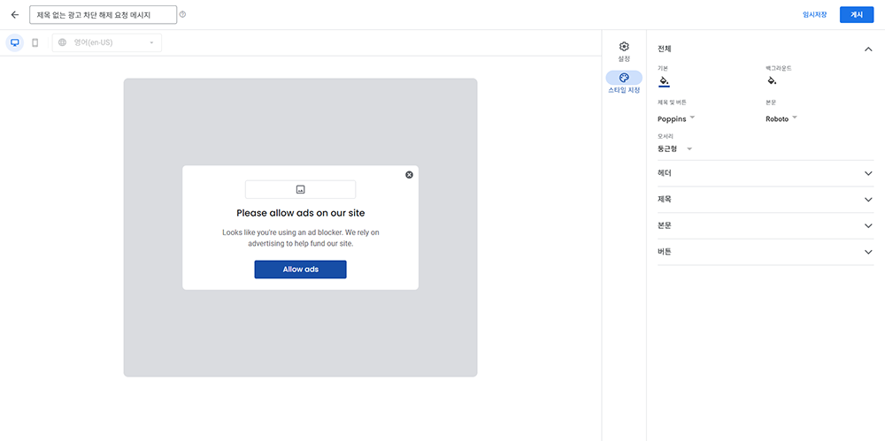 2단계: 광고 차단 회복 만들기에서 광고 차단 해제 요청 메시지 생성 및 맞춤 설정