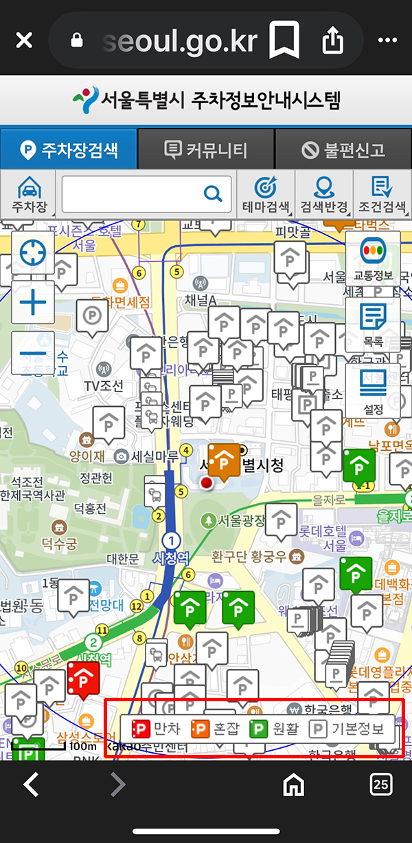 아래는 아이폰에서 구글 검색으로 서울시 주차장 이라는 문장으로 검색하여 서울특별시 주차정보안내시스템에 접속 한 내용입니다.