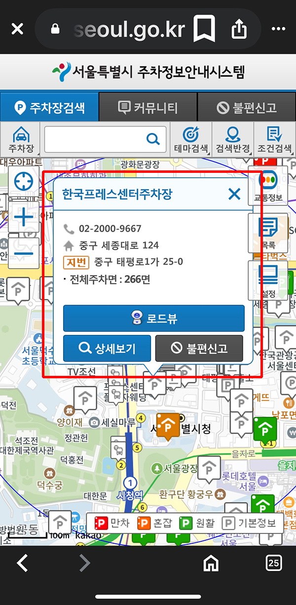 아래는 포털에서 서울시 주차장 이라는 문장으로 검색하여 서울특별시 주차정보안내시스템에 접속 한 내용입니다.