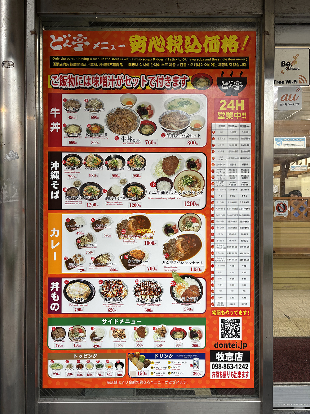 오키나와에서 늦은 밤이나 이른 아침, 합리적인 저렴한 가격으로 현지 음식을 즐기고 싶다면 돈테이(どん亭)가 정답입니다. 이 현지 체인점은 24시간 운영되며 , 맛있는 규동, 오키나와 소바, 카레 등을 저렴한 가격에 제공하여 현지인과 여행객 모두에게 사랑받는 곳입니다. 오늘은 돈테이의 주요 지점, 메뉴, 이용 방법, 그리고 메뉴등을 알아보겠습니다.