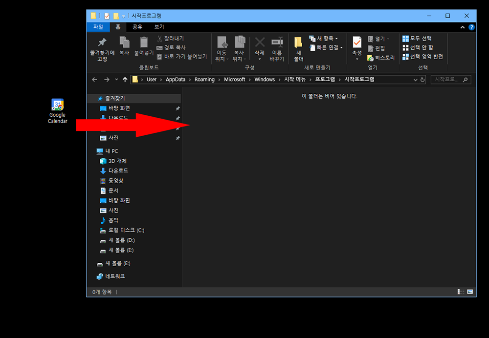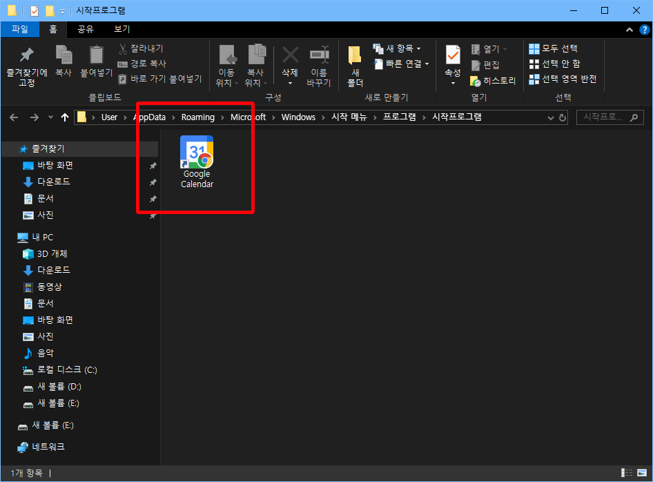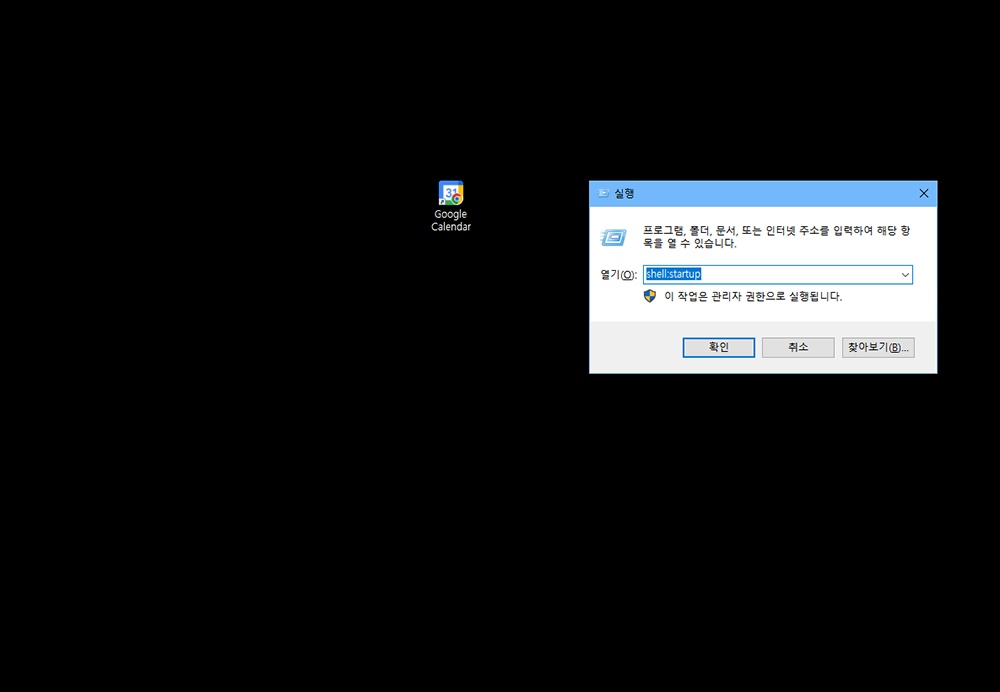 아래는 시작 프로그램 폴더 안에 구글 캘린더 바로가기가 정상적으로 추가된 모습입니다
