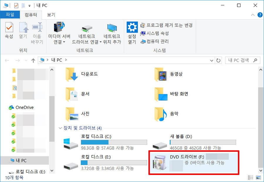 내 PC → 장치 및 드라이브 항목에 들어가 보면 CD/DVD 드라이브가 하나 추가된 것을 볼 수 있습니다.