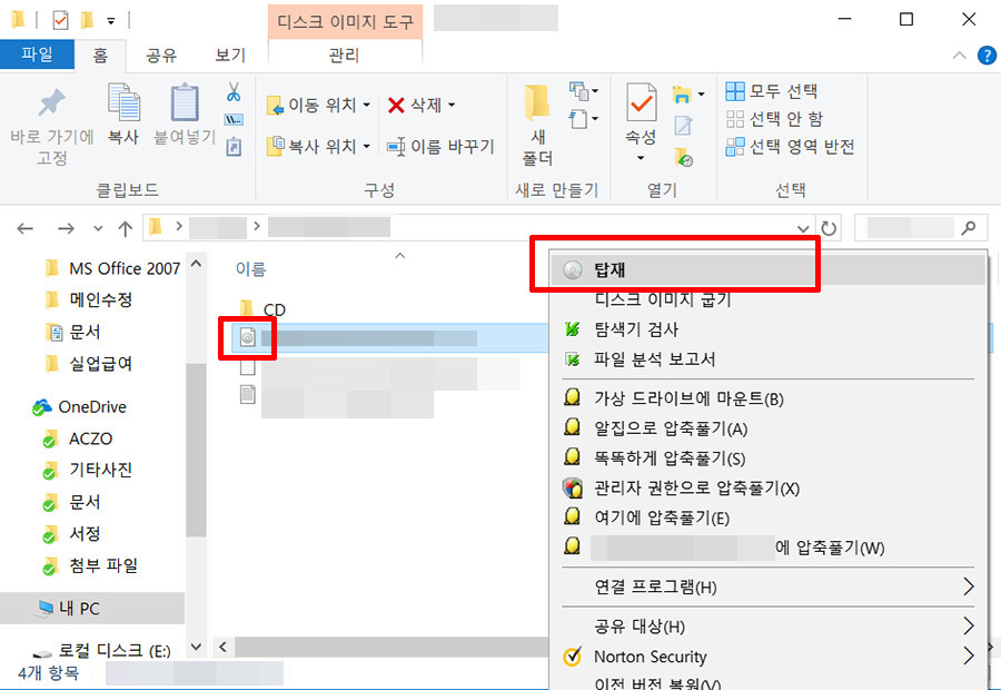 ISO 파일 위에서 마우스 오른쪽 버튼을 클릭한 뒤 메뉴에서 [탑재] 를 선택합니다.
