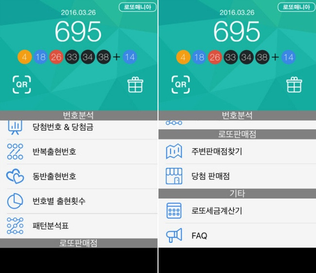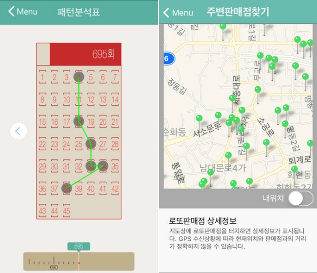 당첨 되었던 로또의 패턴을 볼 수 있으며 내 주변의 로또 판매점을 찾을 수 있습니다.