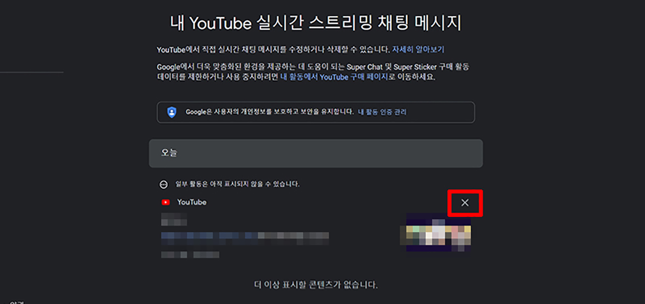 5. X를 누르면 내 유튜브(You Tube) 실시간 스트리밍 채팅 메세지가 삭제 됩니다.
