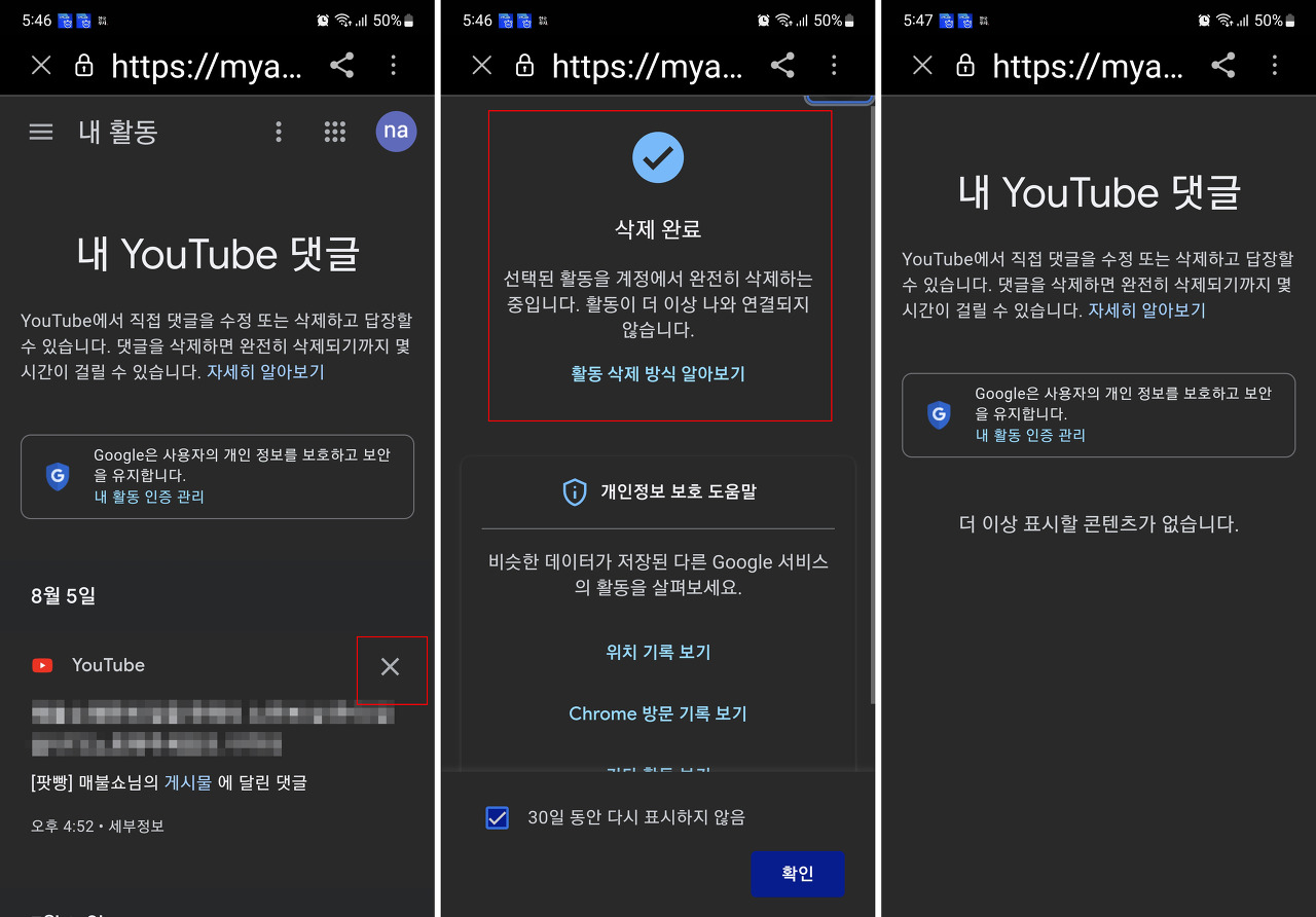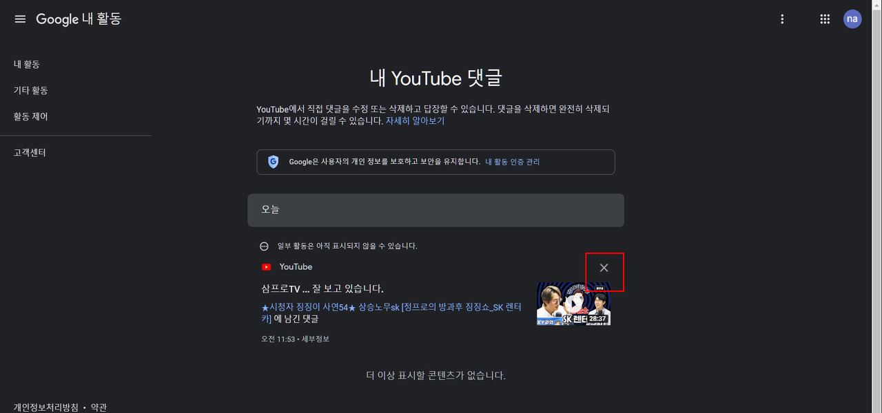 3. 아래 와 같이 X를 하면 내 유튜브(You Tube)댓글이 삭제가 됩니다.
