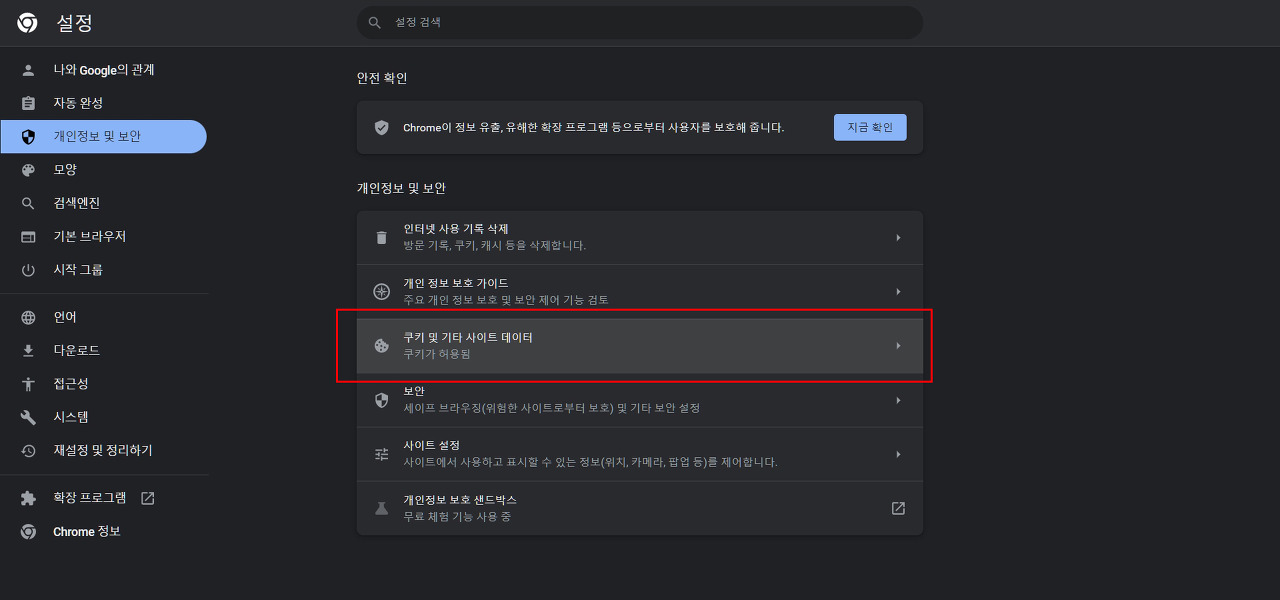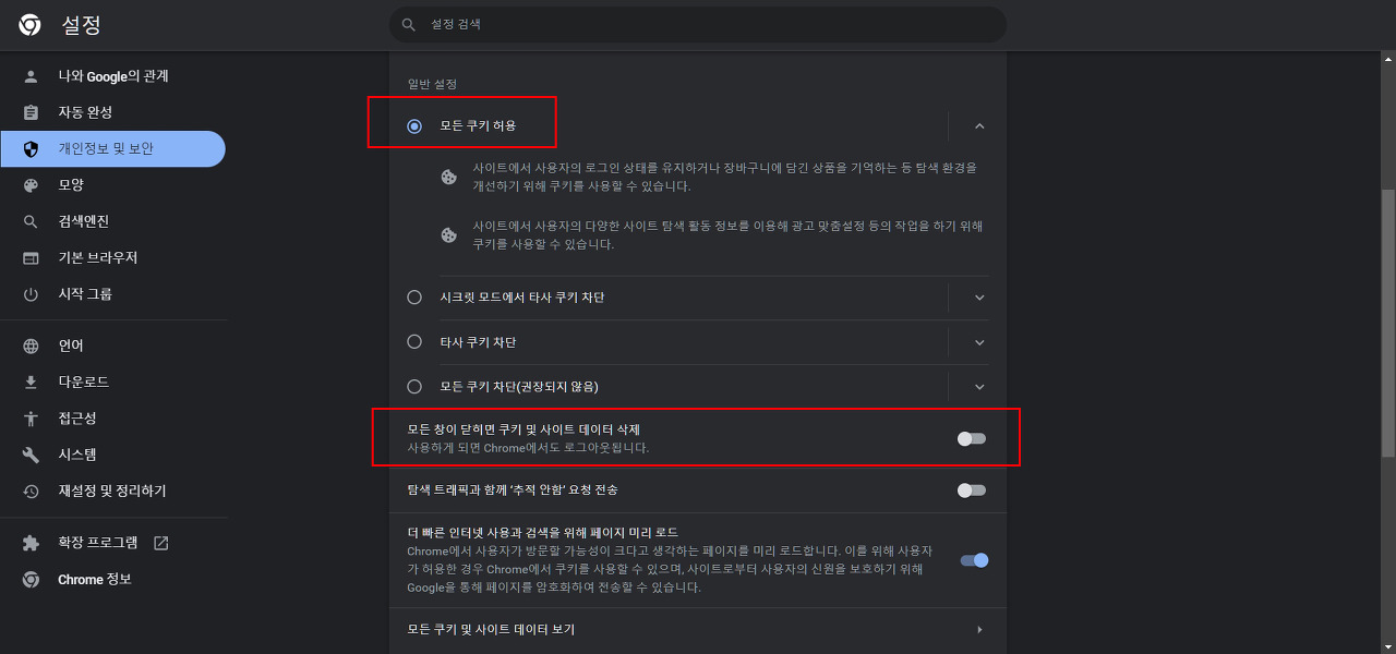 6. 모든 쿠키 허용에 체크하고 모든 창이 닫히면 쿠키 및 사이트 데이터 삭제를 선택 해제하면 다시 로그인 시 2단계 인증을 하라는 메시지가 나오지 않게 됩니다.
