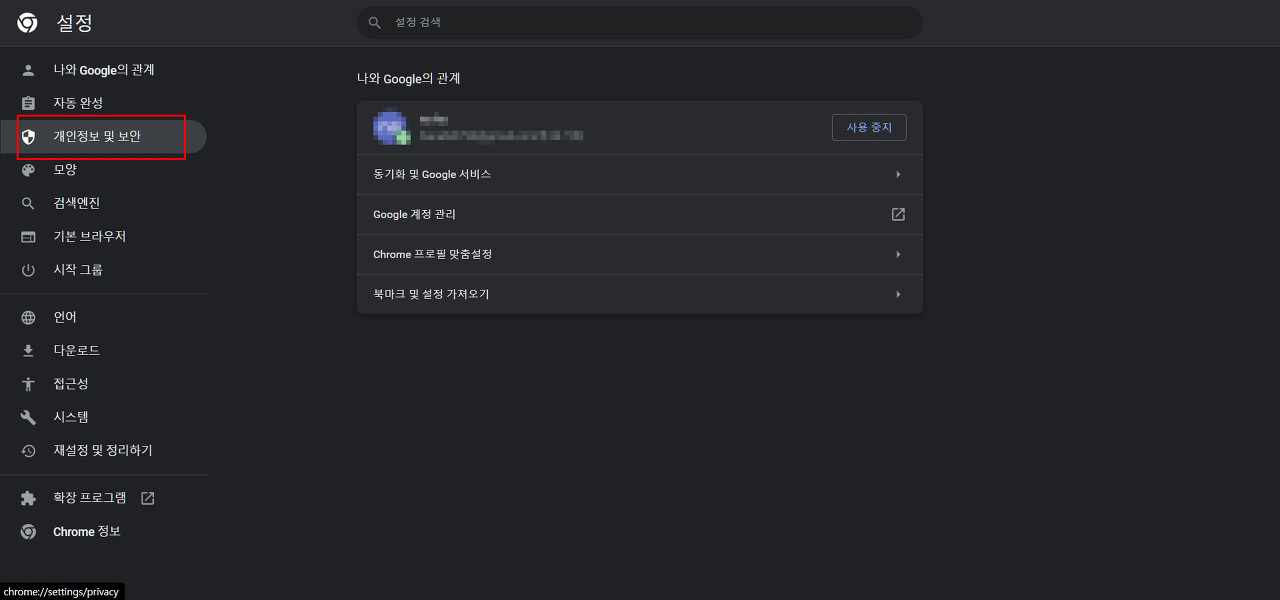 4. 좌측의 개인정보 및 보안을 클릭합니다.