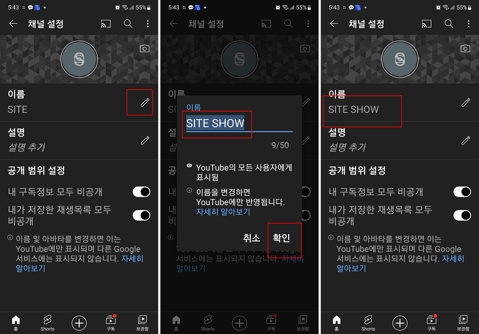 -기본정보 선택 후 연필 모양 수정 선택 후 채널명 변경