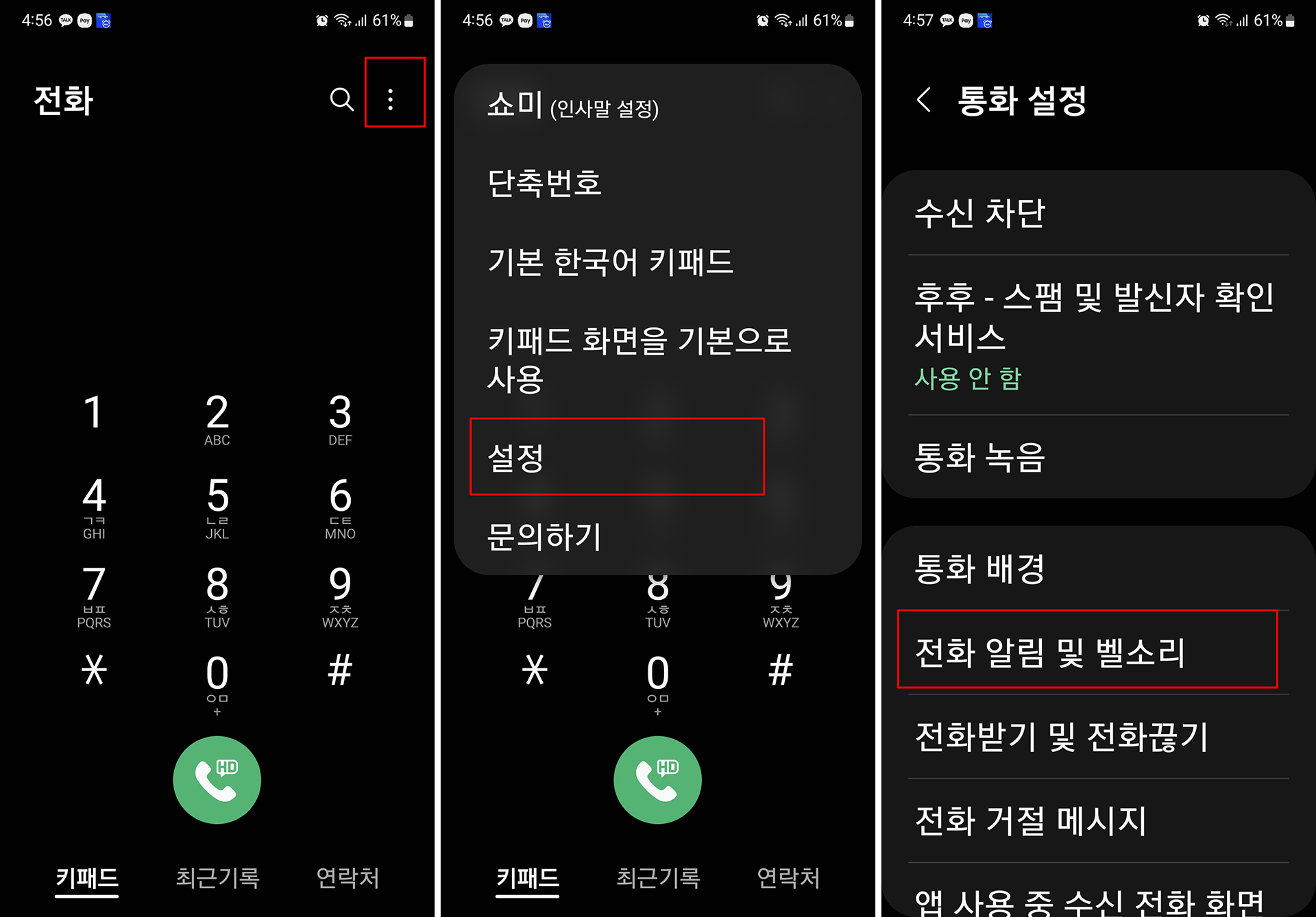 1. 스마트폰의 전화로 들어가 상단 점세개를 클릭하여 설정으로 들어간 후 전화 알림 및 벨소리로 들어가서 통화 중 알림 및 알람 소리 허용을 활성화합니다.
