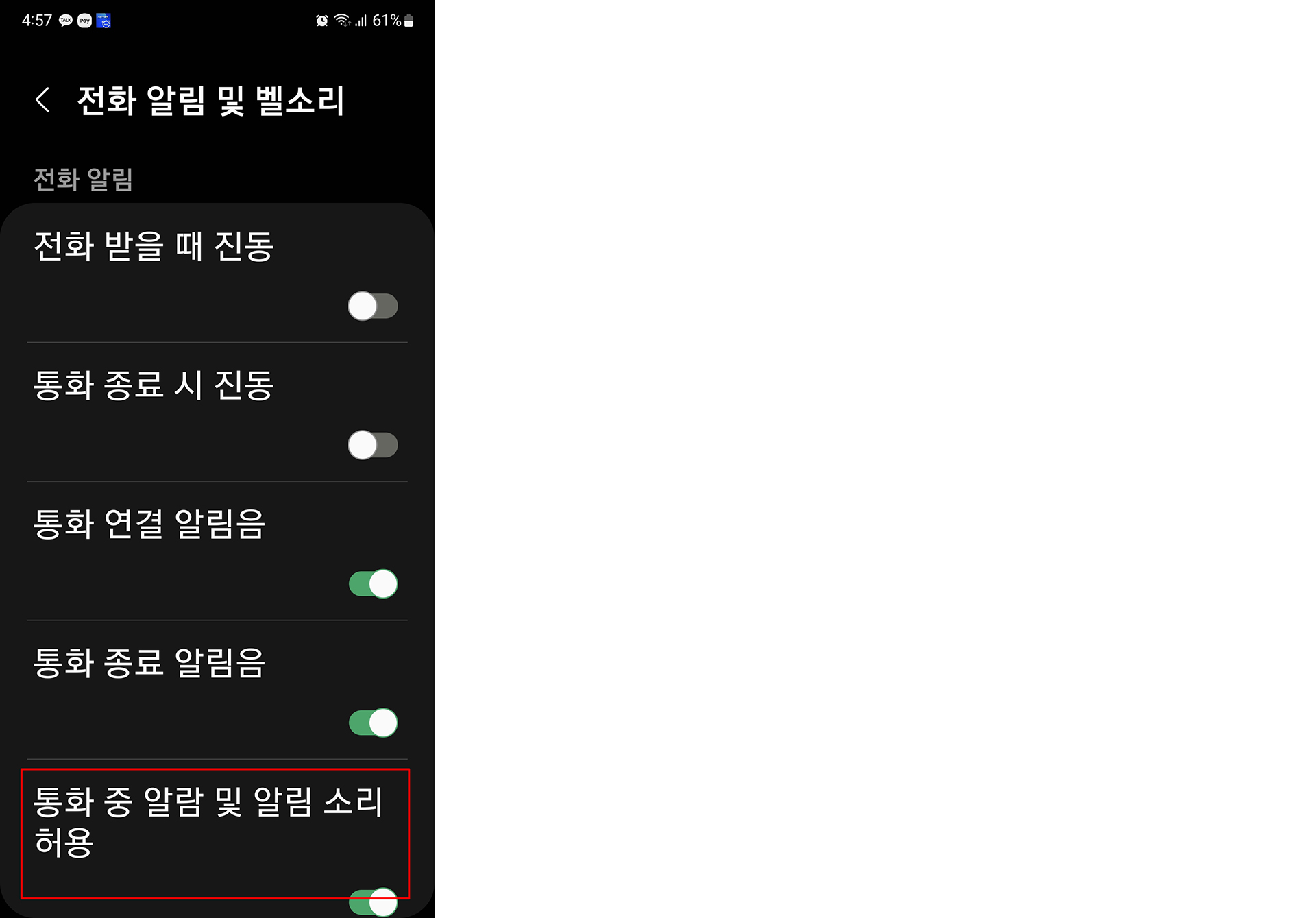 *통화 중 알람 및 알림 소리 허용을 체크 활성화합니다.