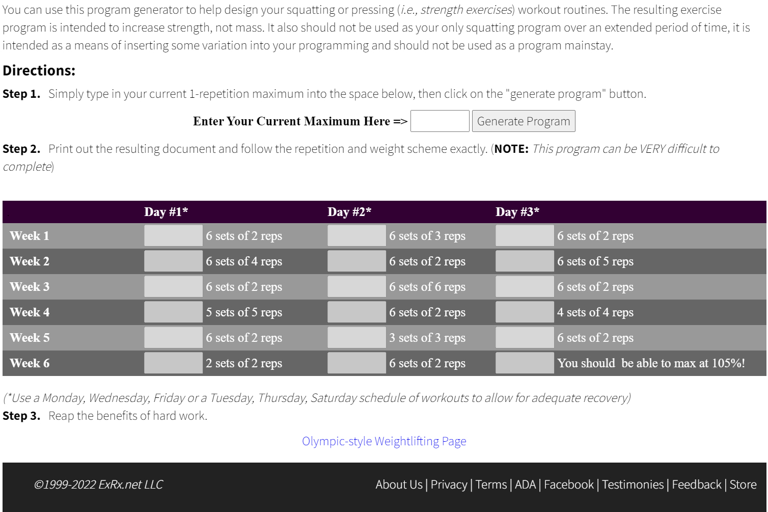 아래의 링크는 러시안 스쿼트에 대하여 최대 중량(1RM)만 입력하면 러시안 스쿼트 프로그램이 생성됩니다. 스쿼트시 중량이 늘지 않아 고민이신 분들은 한 번 도전해 볼만한 프로그램입니다.