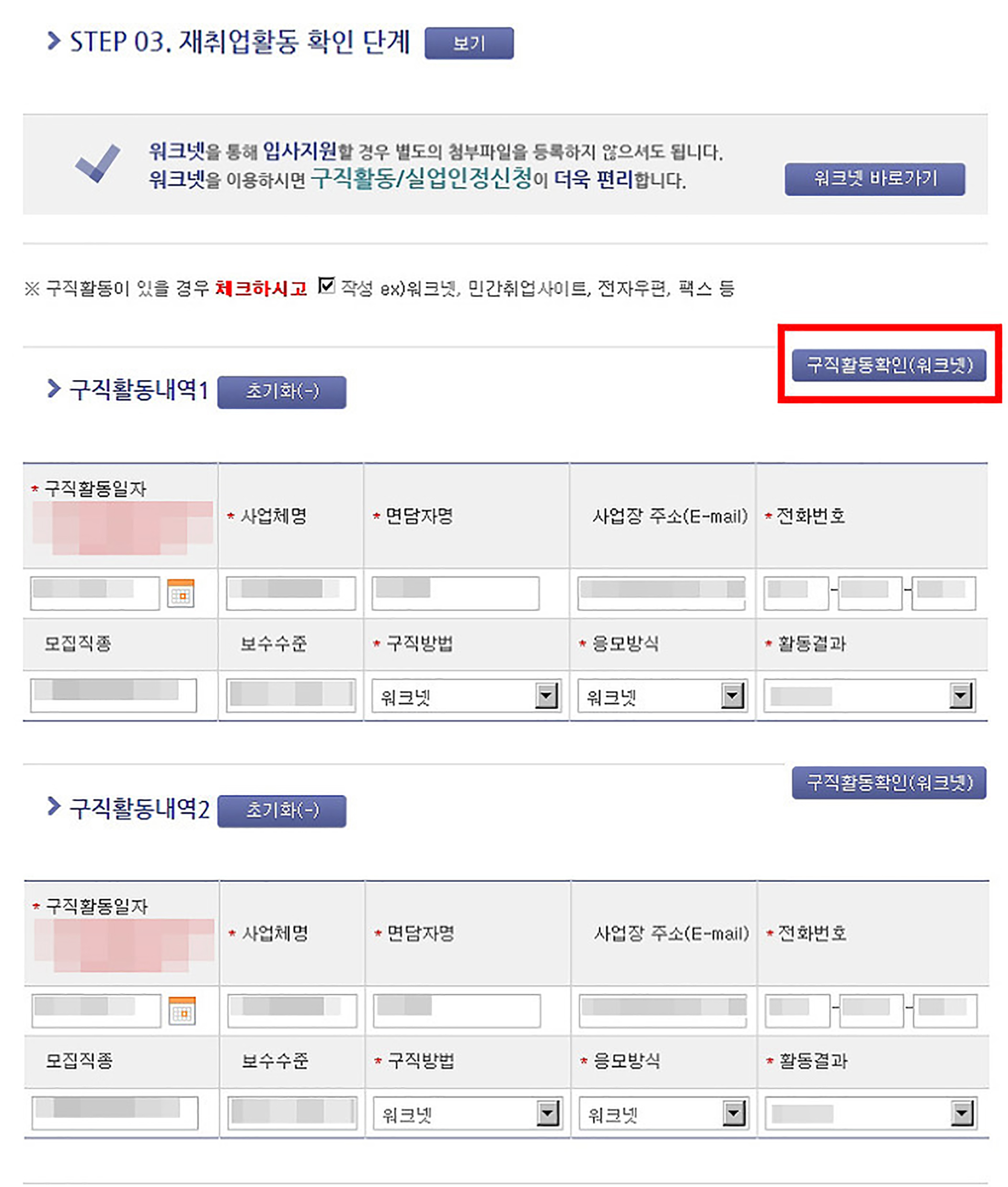 그림은 워크넷의 경우입니다. 그 밖의 경우도 아래와 같은 방법으로 입력하시면 되지만 구직활동을 하신 홈페이지에서 구직활동을 증명할만한 자료를 첨부하셔야 합니다.