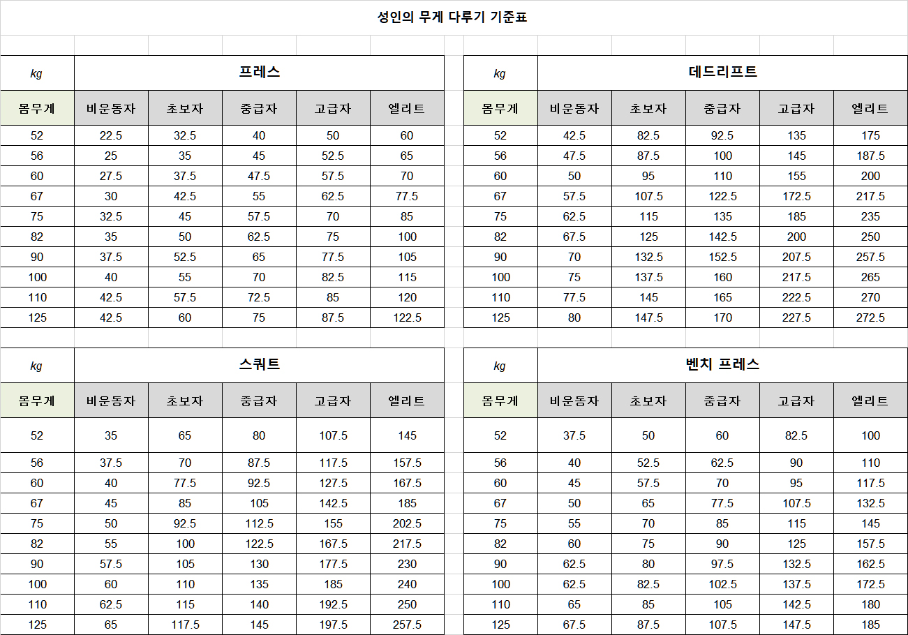 아래 내용에 보이는 기준표는 역도(weight lifting)에서 파생된 기준표이며 모든 운동하는 사람들의 절댓값이 될 수는 없다는 점을 알고 참고만 하시기 바랍니다.