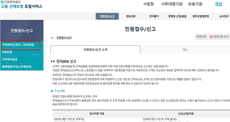 왼쪽 카테고리에서 자격관리(근로자,피보험자)를 선택합니다.