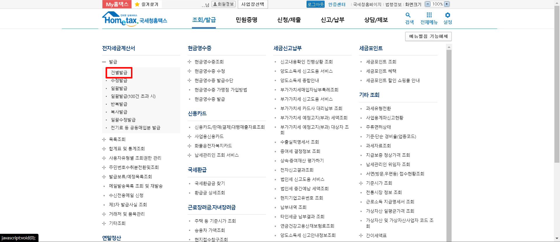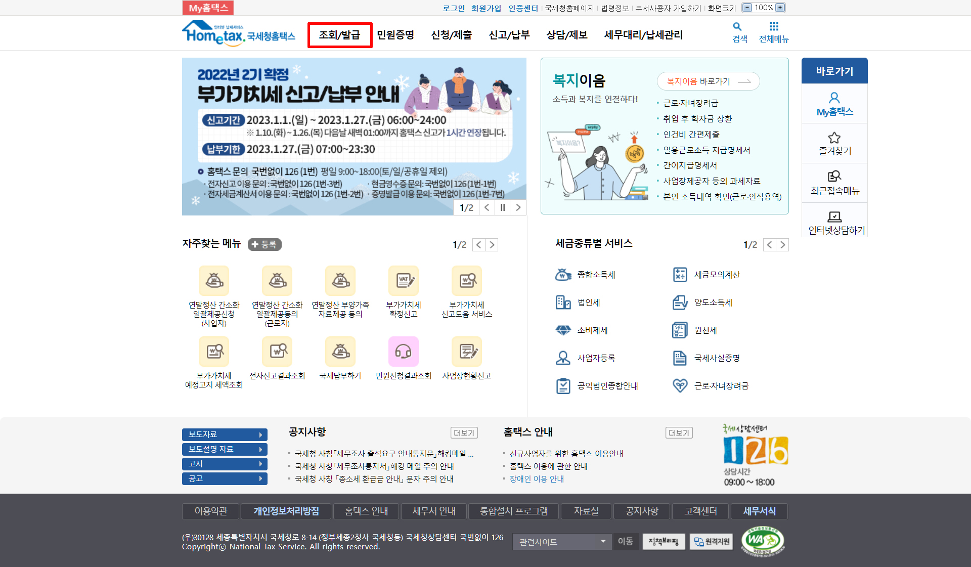 홈텍스 홈페이지 로그인 후 조회/발급 선택