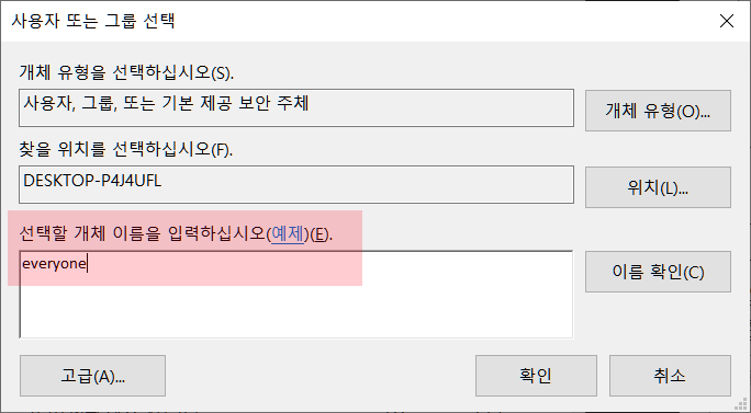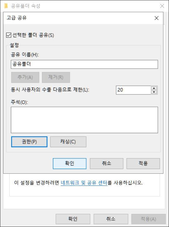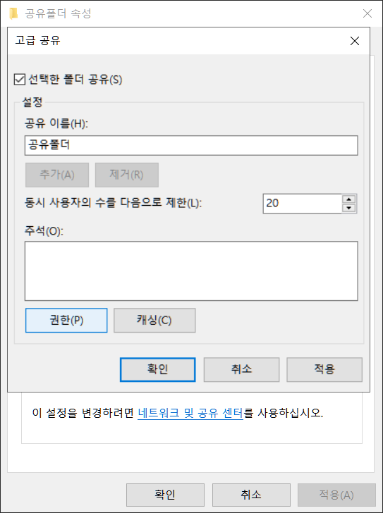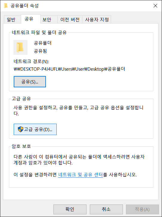 공유폴더 속성에서 공유를 통해 고급공유로 들어갑니다.