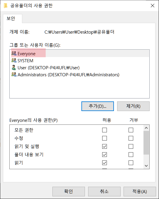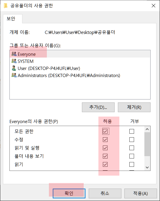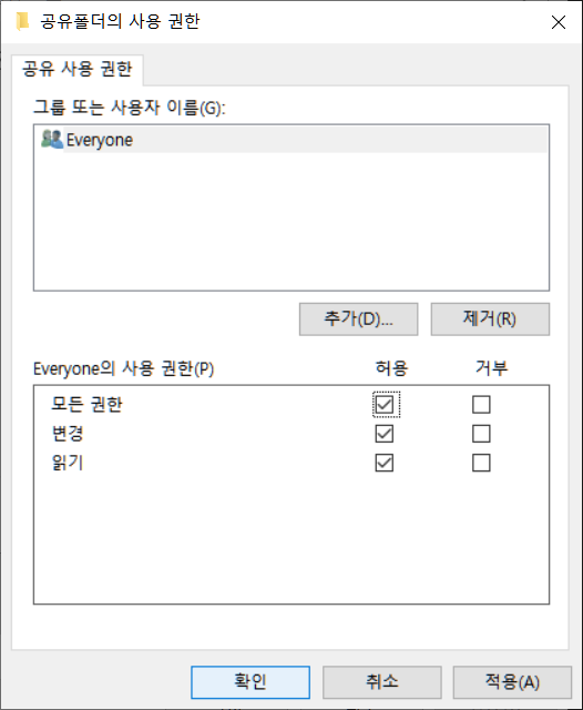 공유폴더의 사용권한에서 아래 그림들과 같이 설정합니다.
