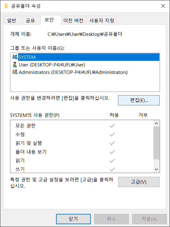 보안탭으로 들어가 편집을 선택합니다.