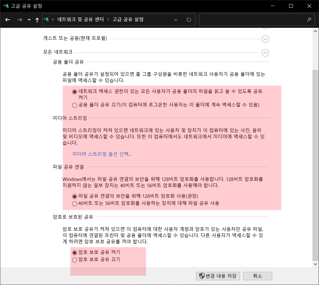 모든 네트워크에서 아래와 같이 체크박스에 체크합니다. 집에서 사용하려면 암호 보호 공유 끄기가 편리합니다.