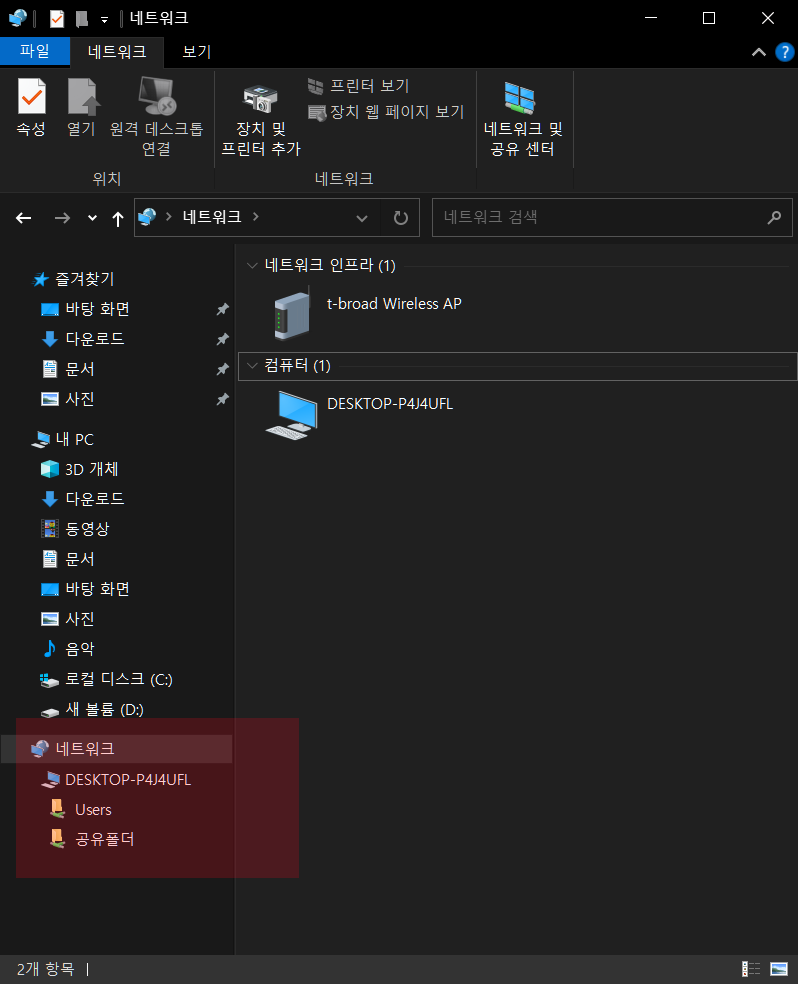 검색창에서 네트워크로 들어가면 공유폴더가 생성되었습니다. 이제 이 공유폴더를 통해 여러 가지 피일들을 공유하면 됩니다.