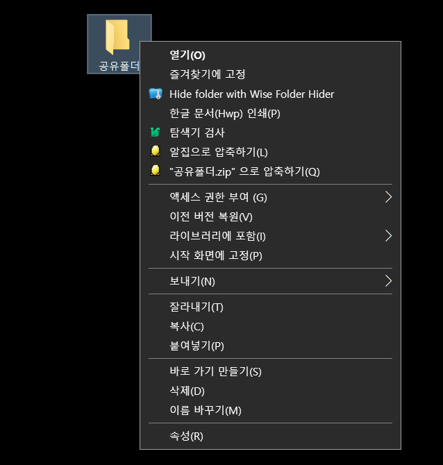 바탕회면에 공유폴더를 만들고 우클릭하여 속성으로 들어갑니다.