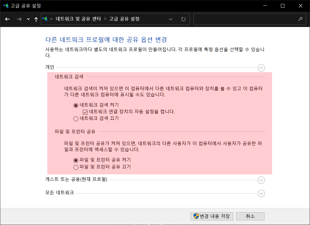아래와 같이 개인에서 네트워크 검색과 파일 및 프린터 공유 켜기의 체크박스에 체크합니다.