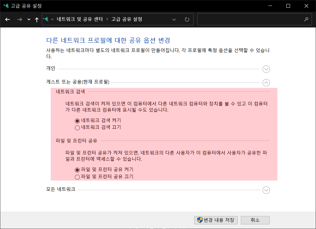 게스트 또는 공용에서 네트워크 검색과 파일 및 프린터 공유 켜기의 체크박스에 체크합니다.