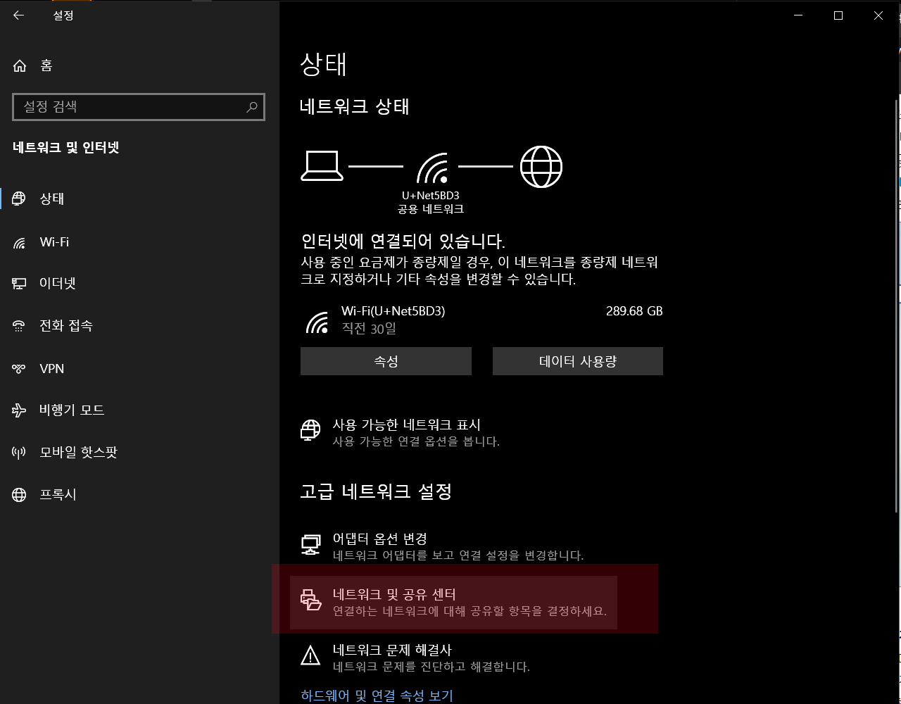 네트워크 및 공유 센터를 클릭합니다.